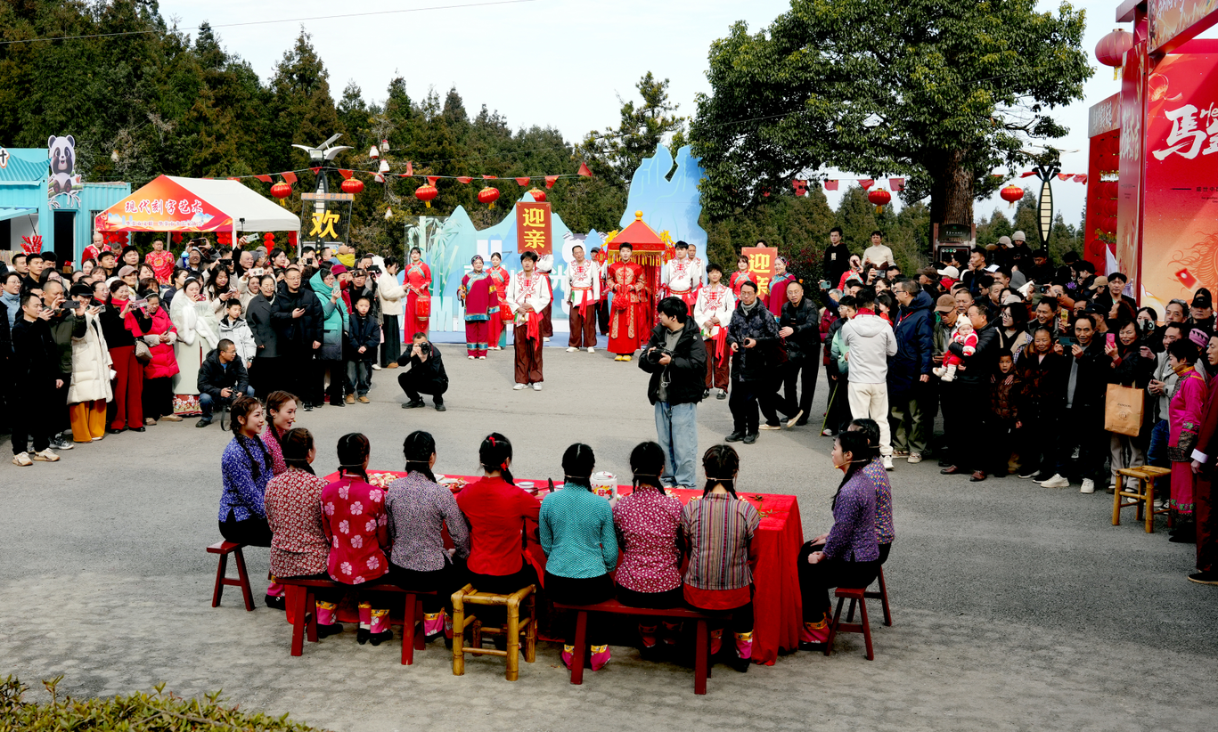 直播现场年味浓郁、人气高涨。滑竿抬幺妹、云童舞等非遗民俗轮番上演,锣鼓声与欢笑声回荡山间,凭借温润生态、烟火民俗与高品质旅居体验,成为川渝新春休闲度假的热门之选。