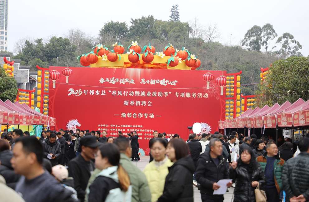 2月24日,邻州广场人头攒动、气氛热烈,2026年邻水县“春风行动·就业援助季”专项服务活动渝邻协作专场招聘会在此举行。来自渝邻两地100余家企业齐聚一堂,带来3000多个就业岗位,吸引大批求职者前来咨询应聘。