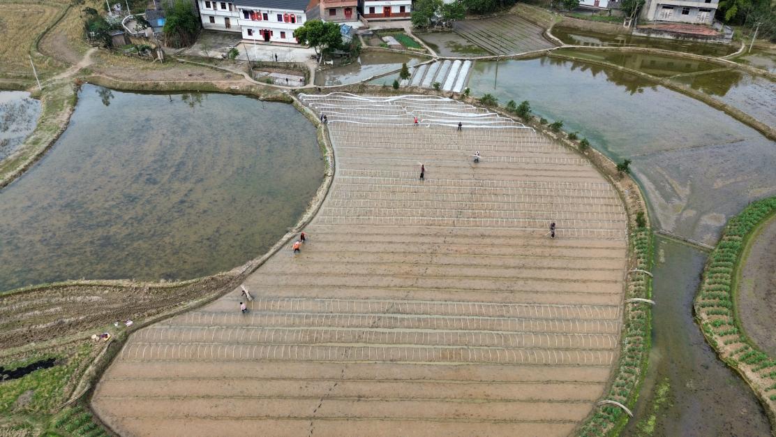 与此同时,花桥镇新寺村的水稻育秧工作也在有条不紊推进。农户们分工协作、默契配合,撒种、搭架、盖膜等工序一气呵成,动作娴熟利落,处处呈现抢时抢墒、高效作业的繁忙景象。