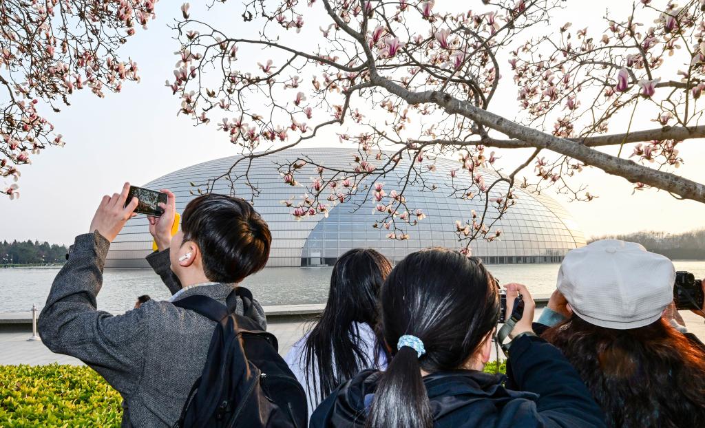 3月12日,摄影爱好者在国家大剧院旁拍摄玉兰花。