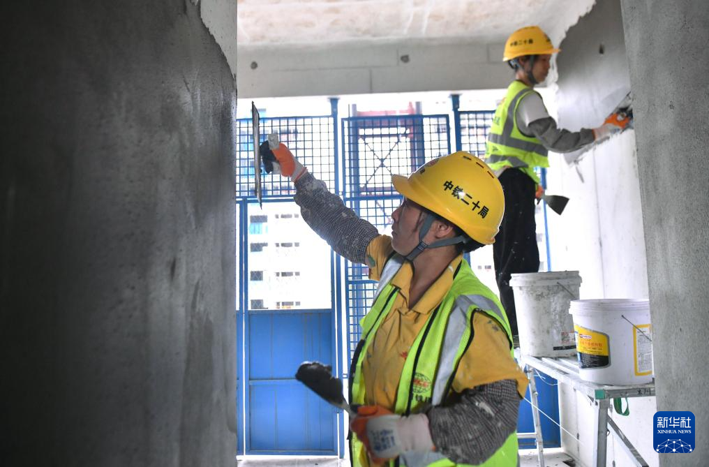 3月16日,在南宁市鸡村城中村改造项目建设现场,中铁二十局工人给房间刮防水砂浆。