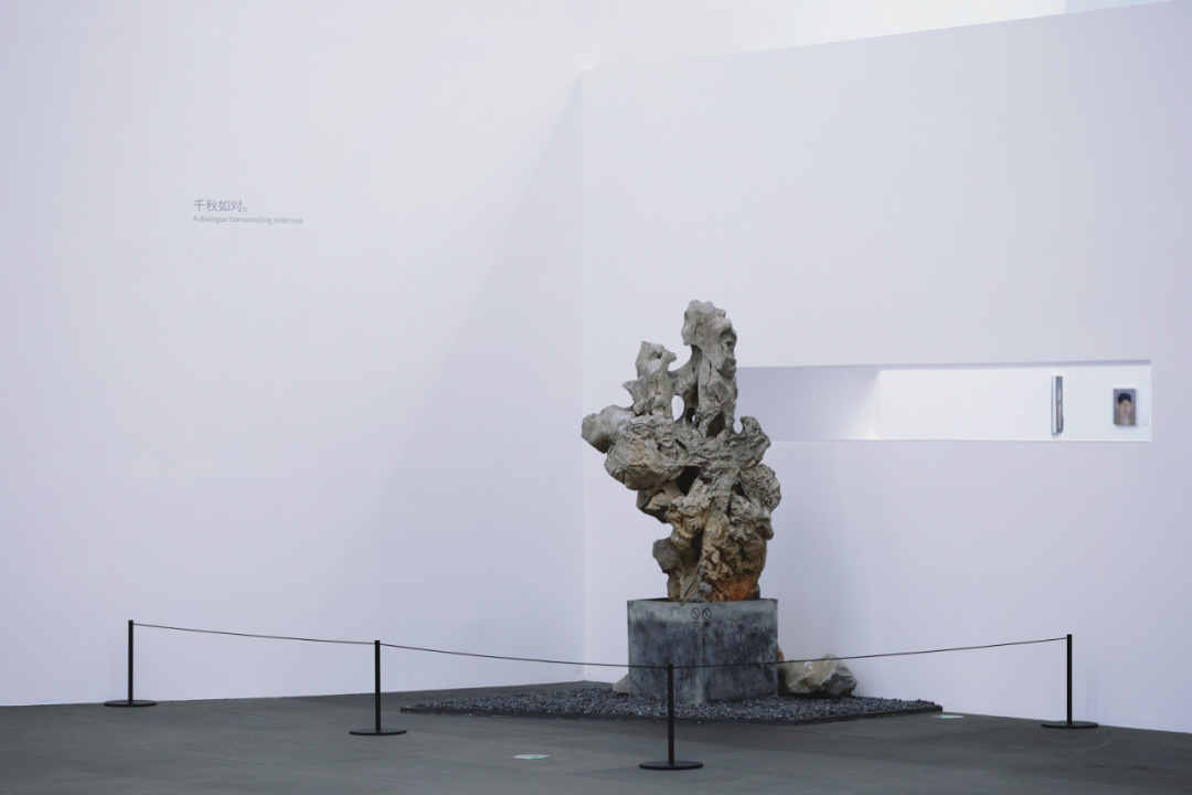 展览共分五个部分。展厅外走廊为文献区域,进入展厅,序章“面孔如石”映入眼帘——太湖石与肖像画相互呼应,石之千姿与人之百态在此相遇,驻足俯仰之间,个体与天地相关照、与宇宙相晤谈,在凝视他者之际反观自我。