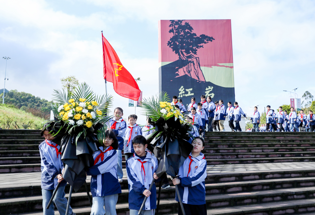 2026年3月30日,四川省华蓥市双河第二小学校的少先队员,抬着花篮向红岩广场“华蓥山游击队群雕”走来,祭奠革命先烈。
