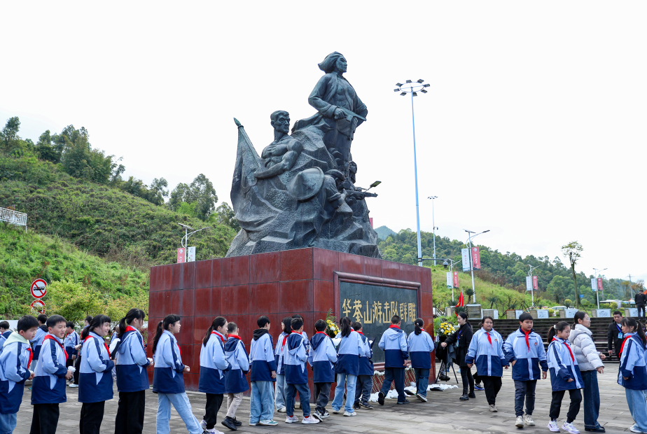2026年3月30日,四川省华蓥市双河第二小学校的少先队员,在红岩广场“华蓥山游击队群雕”前缅怀革命先烈。