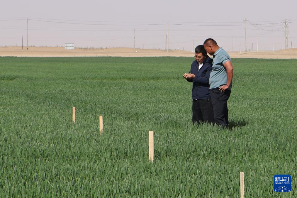 昆玉市玉园镇一处紧邻沙漠的麦田里,管理员在查看麦苗长势(4月11日摄)。