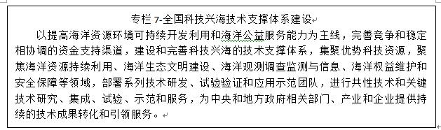 加强大洋海洋环境和资源勘探考察技术应用示范。重点发展大洋环境和资源观测探测技术、深海探测技术、深海矿物资源勘探开发技术,提高大洋科学考察、深海资源探测探采、大洋环境安全保障设备装备的自给率,构建具有自主知识产权的深海矿产资源开采技术装备体系,提升深海生物多样性调查能力。