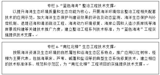 加强海洋生态环境保护、修复与治理技术应用示范。重点推广应用珍稀濒危动物(中华白海豚、斑海豹和绿海龟等)和典型海洋生态系统(珊瑚礁、海草床和红树林等)保护、典型生境修复与生物资源恢复和人工岸段生态化建设、入海污染物和海漂垃圾的综合治理等技术,建立一批标准和规范。发展海洋生态文明示范区建设评估、海洋生物多样性保护、外来物种入侵风险区划、退化/受损生态系统修复诊断、生态系统服务价值评估等技术,并开展集成示范应用。围绕“南红北柳”、“蓝色海湾”等重大工程的实施,建立配套的技术体系,形成若干基于海洋生态系统、海陆统筹的修复模式。